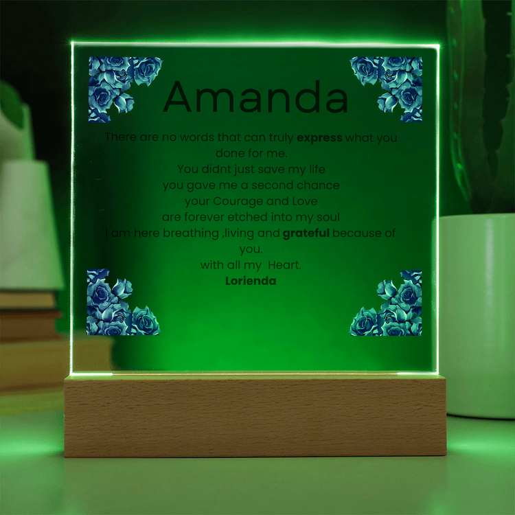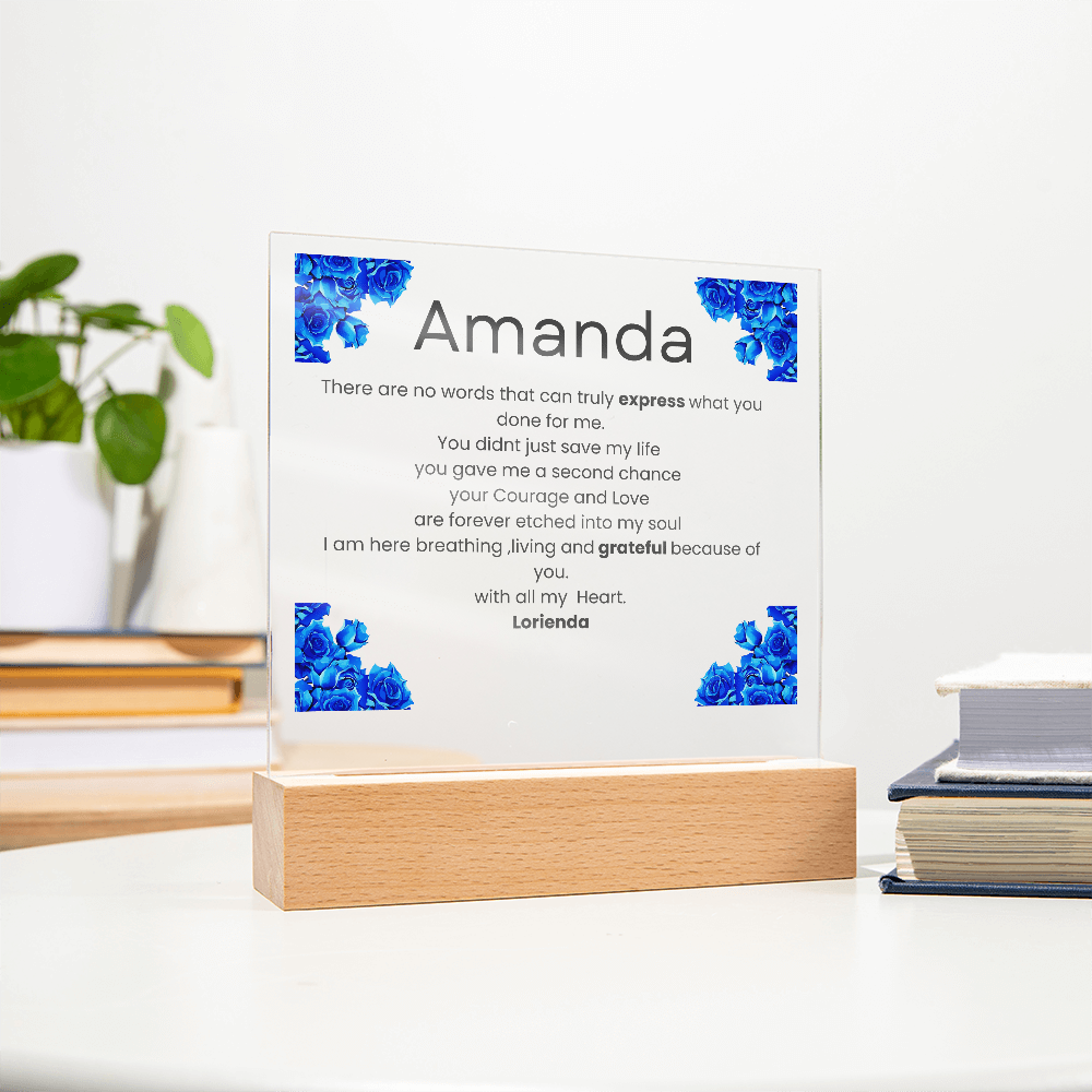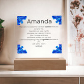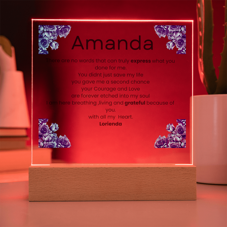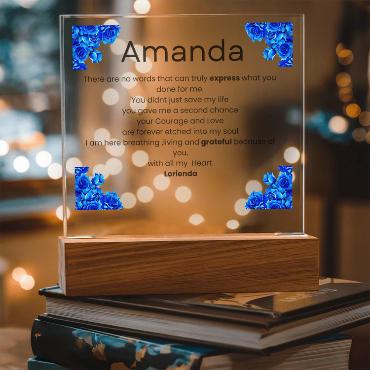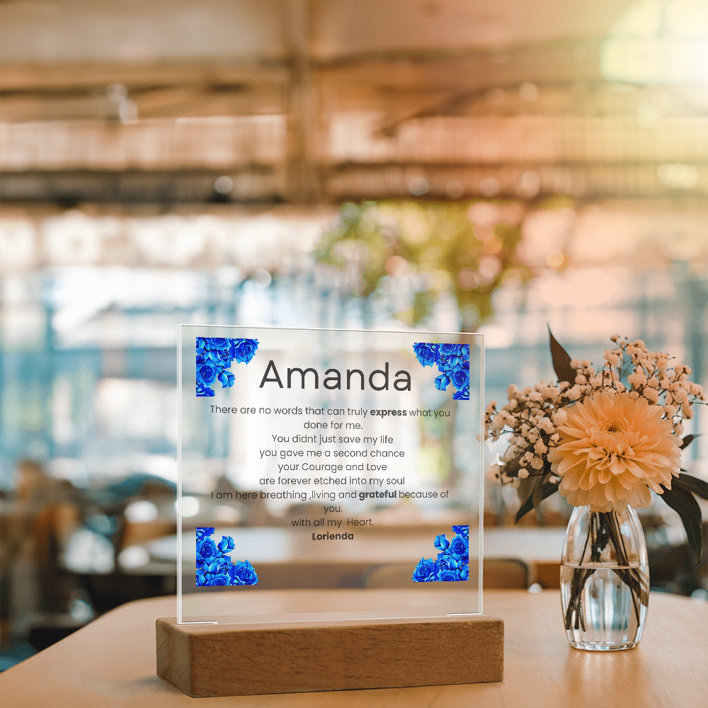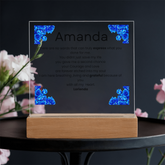 Your plaque will be crafted from premium acrylic with a professionally printed design for a polished look. It comes with a stylish wooden LED base, and you can choose between a USB plug-in option OR a cordless battery-operated option (requires 2 AAA batteries, not included). Both LED bases feature 7 vibrant colors, allowing the user to customize the lighting with various color changes and dynamic cycles.